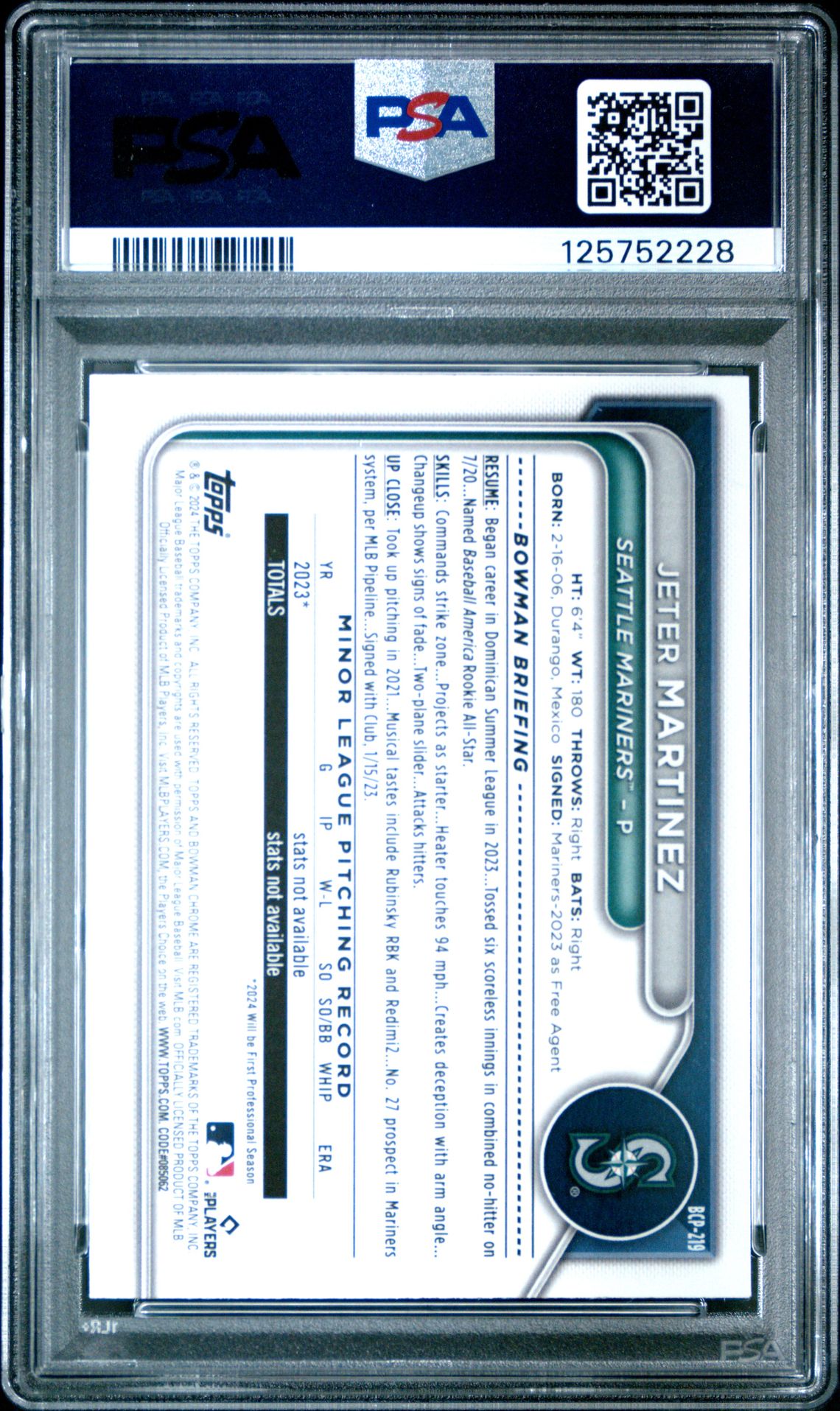 Product Name: 2024 Bowman Chrome Prospects #BCP-219 Jeter Martinez 1st Bowman Purple Shimmer PSA 9