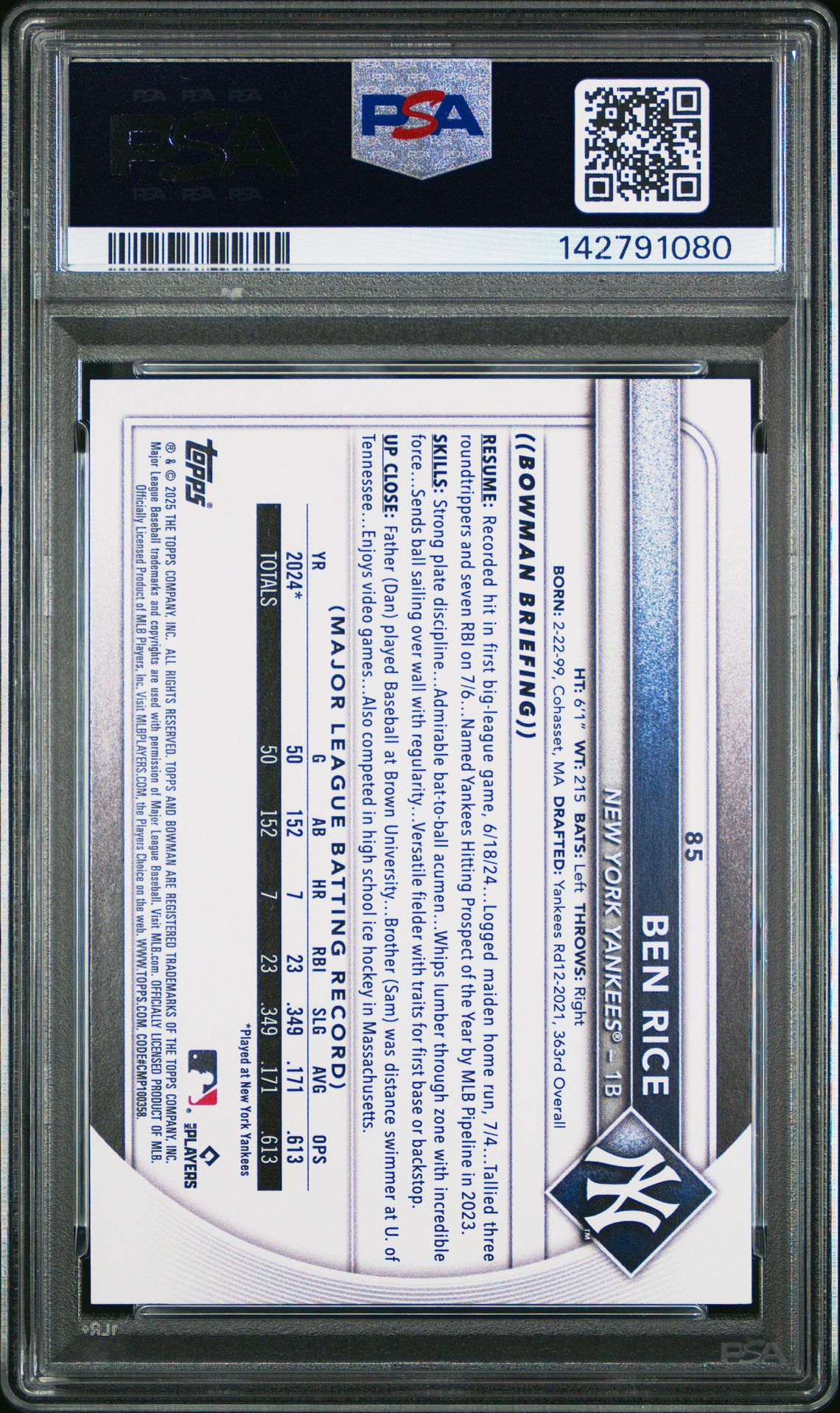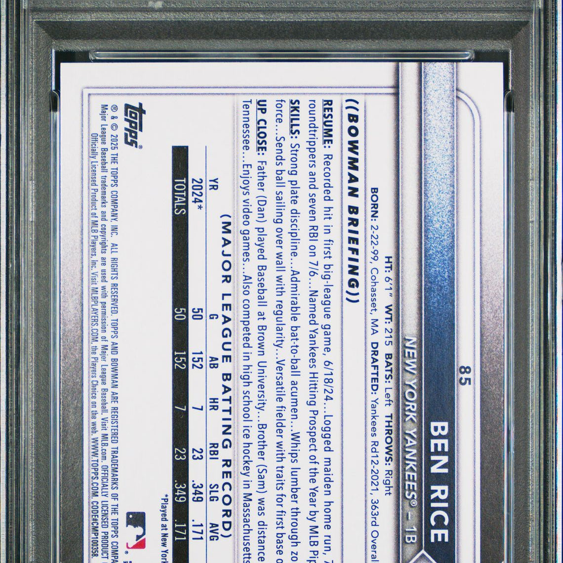 Product Name: 2025 Bowman #85 Ben Rice Rookie PSA 10