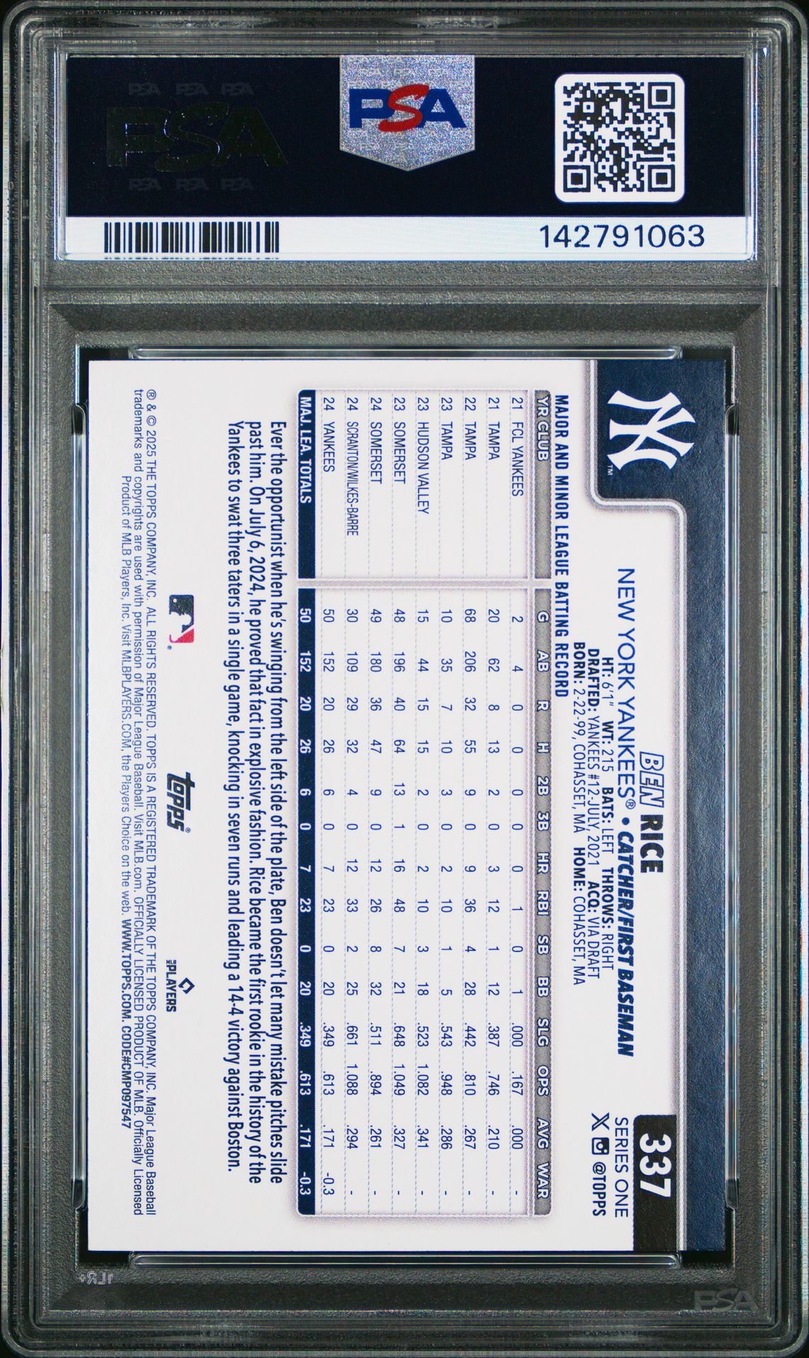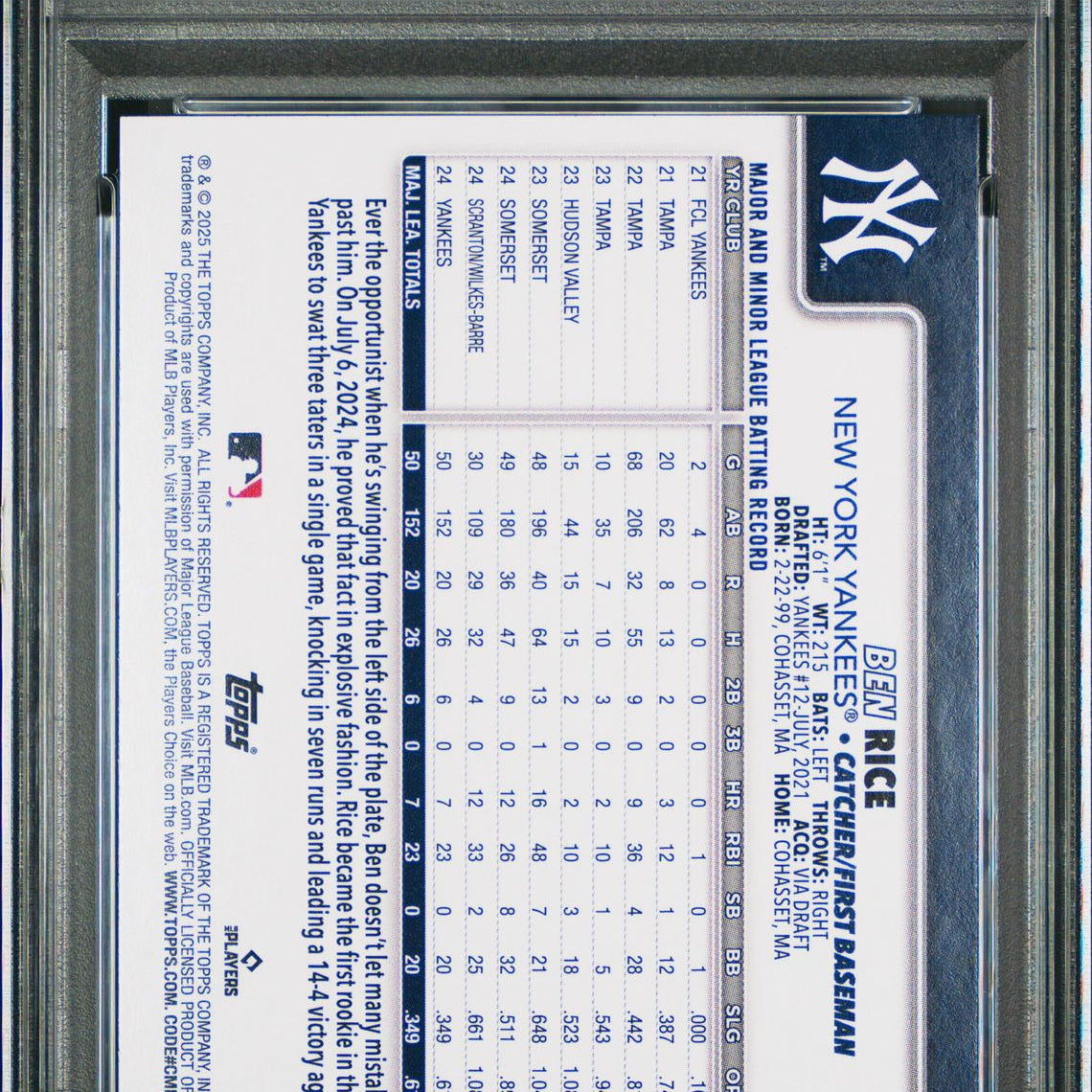 Product Name: 2025 Topps #337 Ben Rice Rookie PSA 10