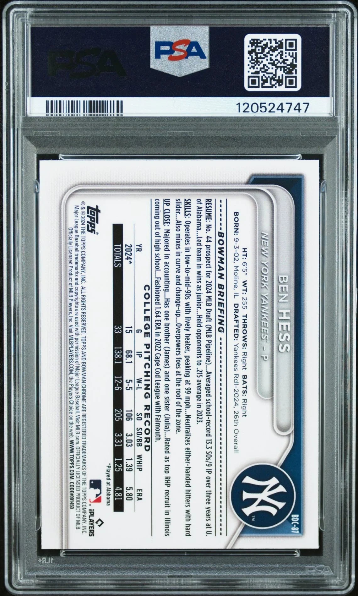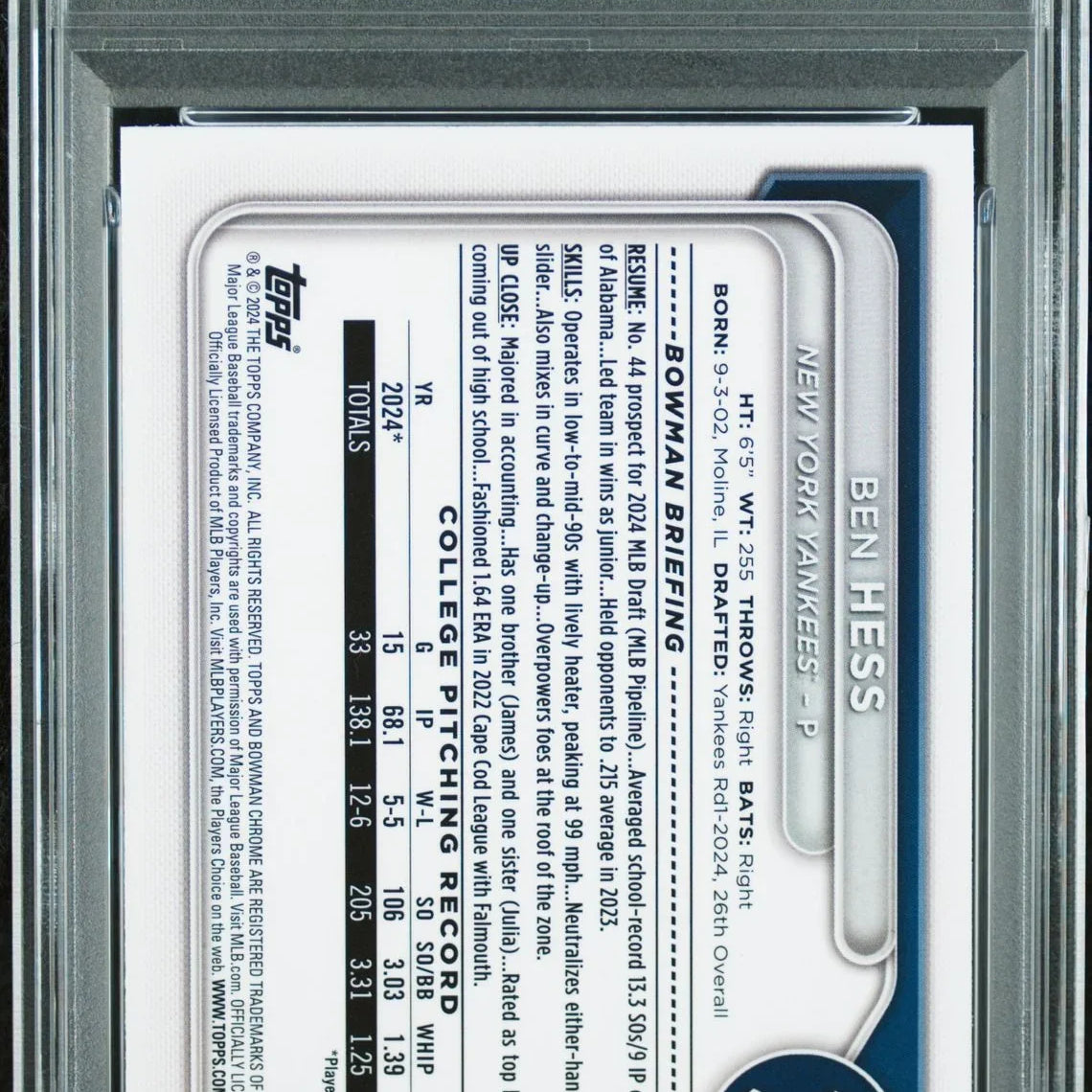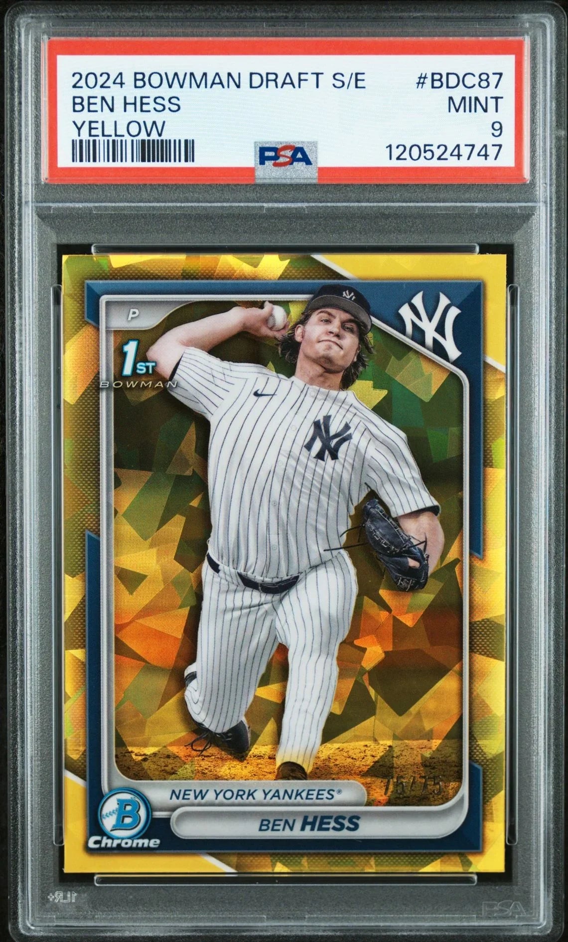 Product Name: 2024 Bowman Draft Chrome Sapphire Edition #BDC-87 Ben Hess 1st Bowman Yellow PSA 9