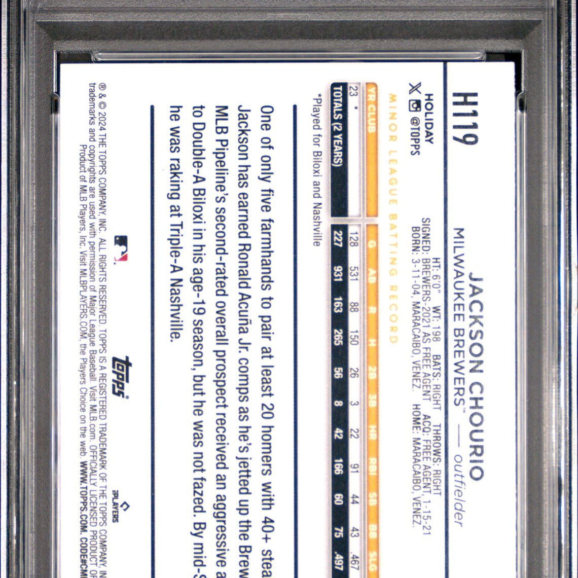 Product Name: 2024 Topps Holiday #H119 Jackson Chourio Rookie PSA 8