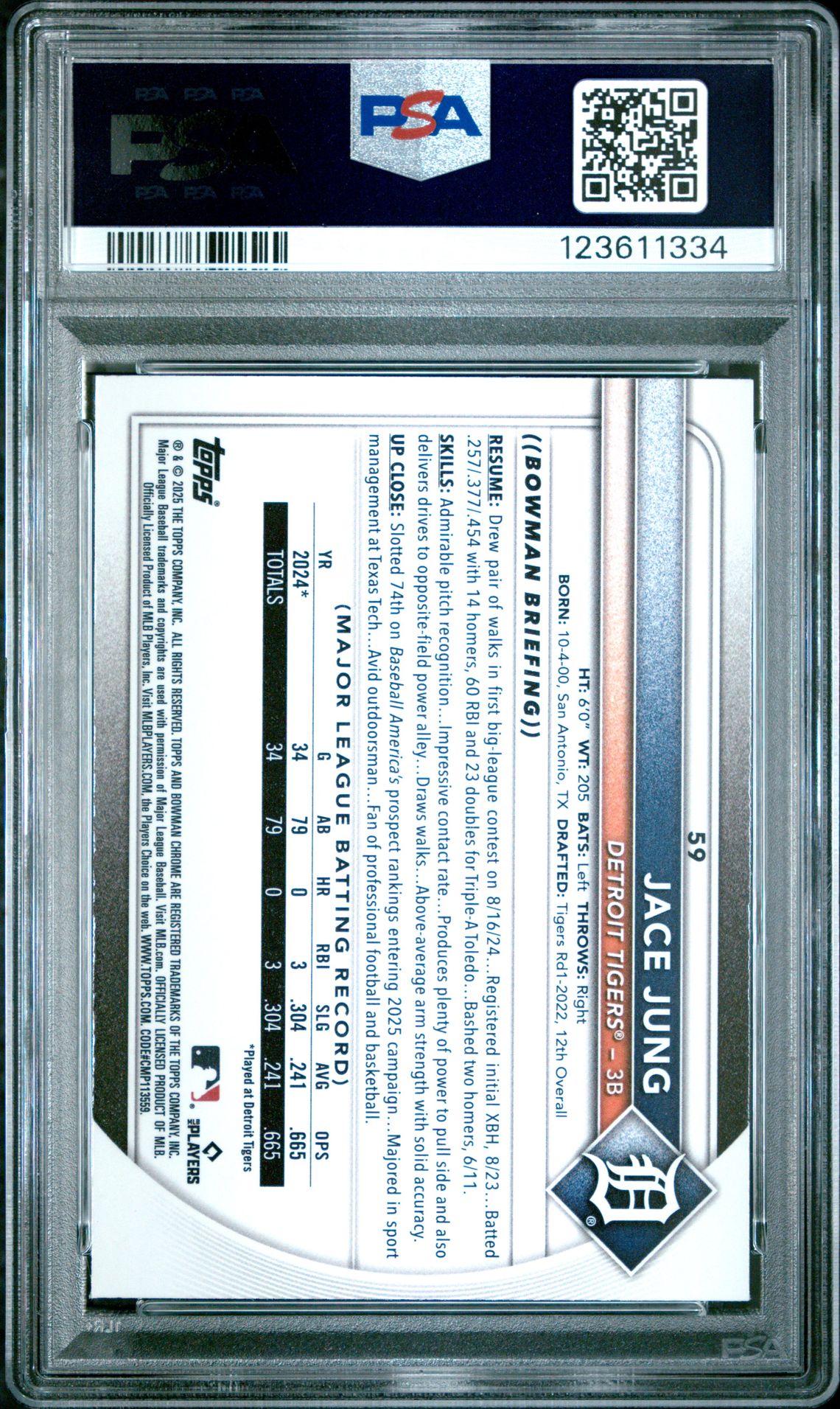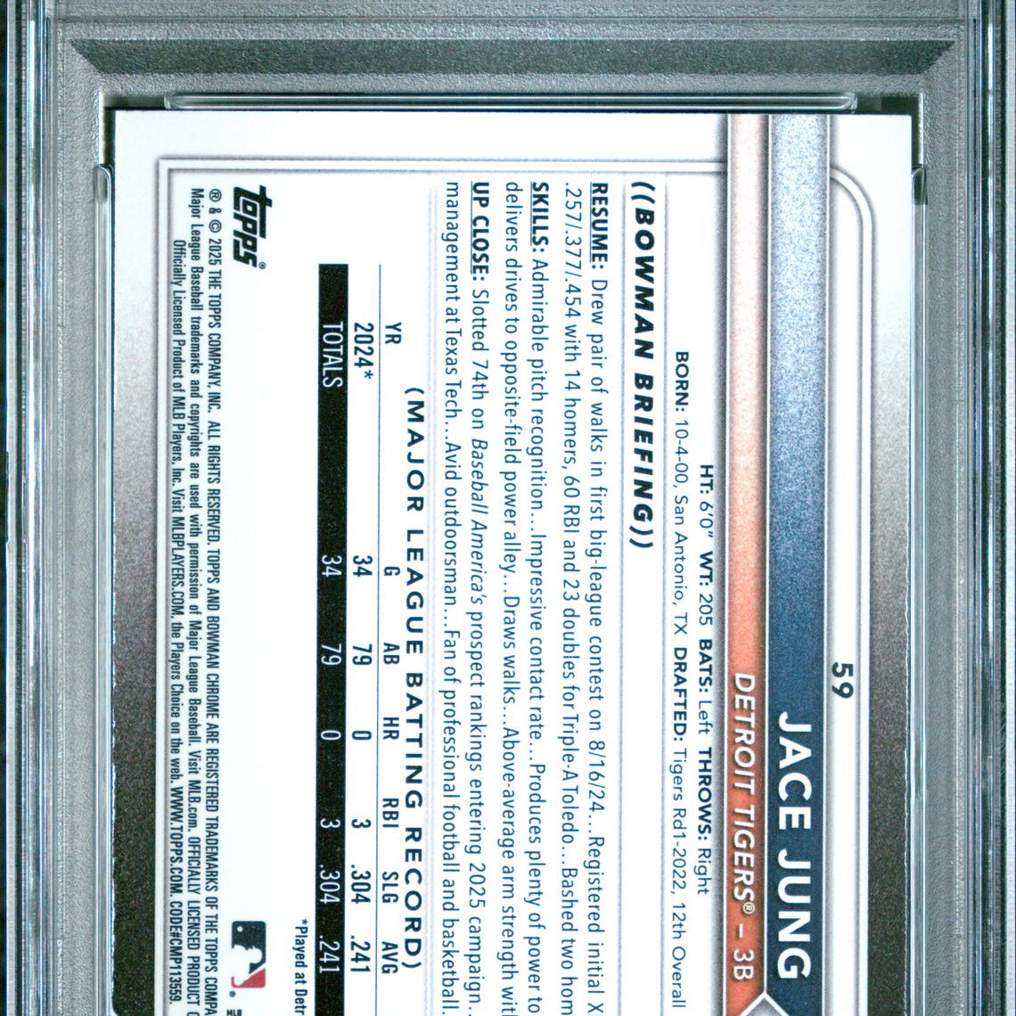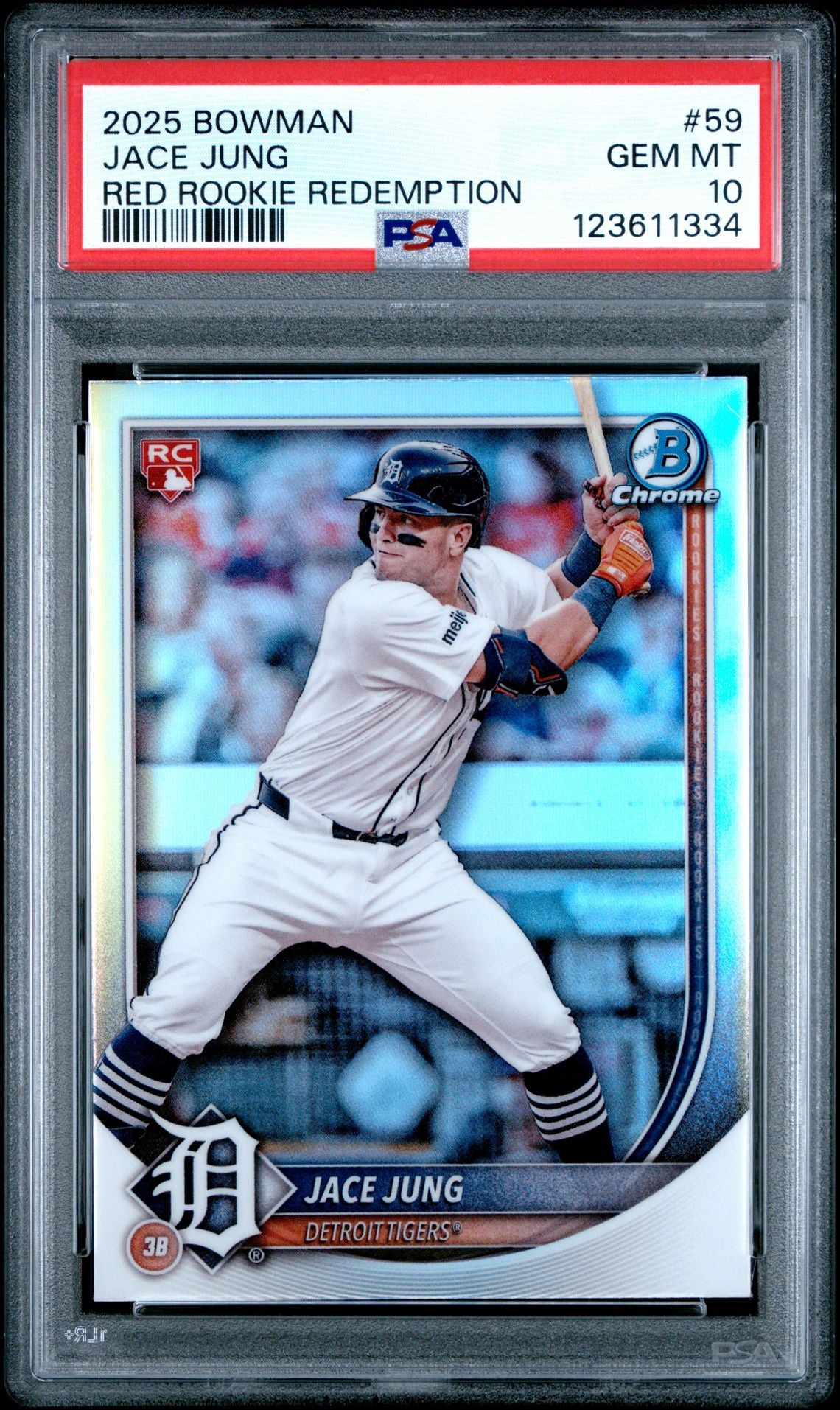 2025 Bowman #59 Jace Jung Chrome Red Rookie Redemption PSA 10