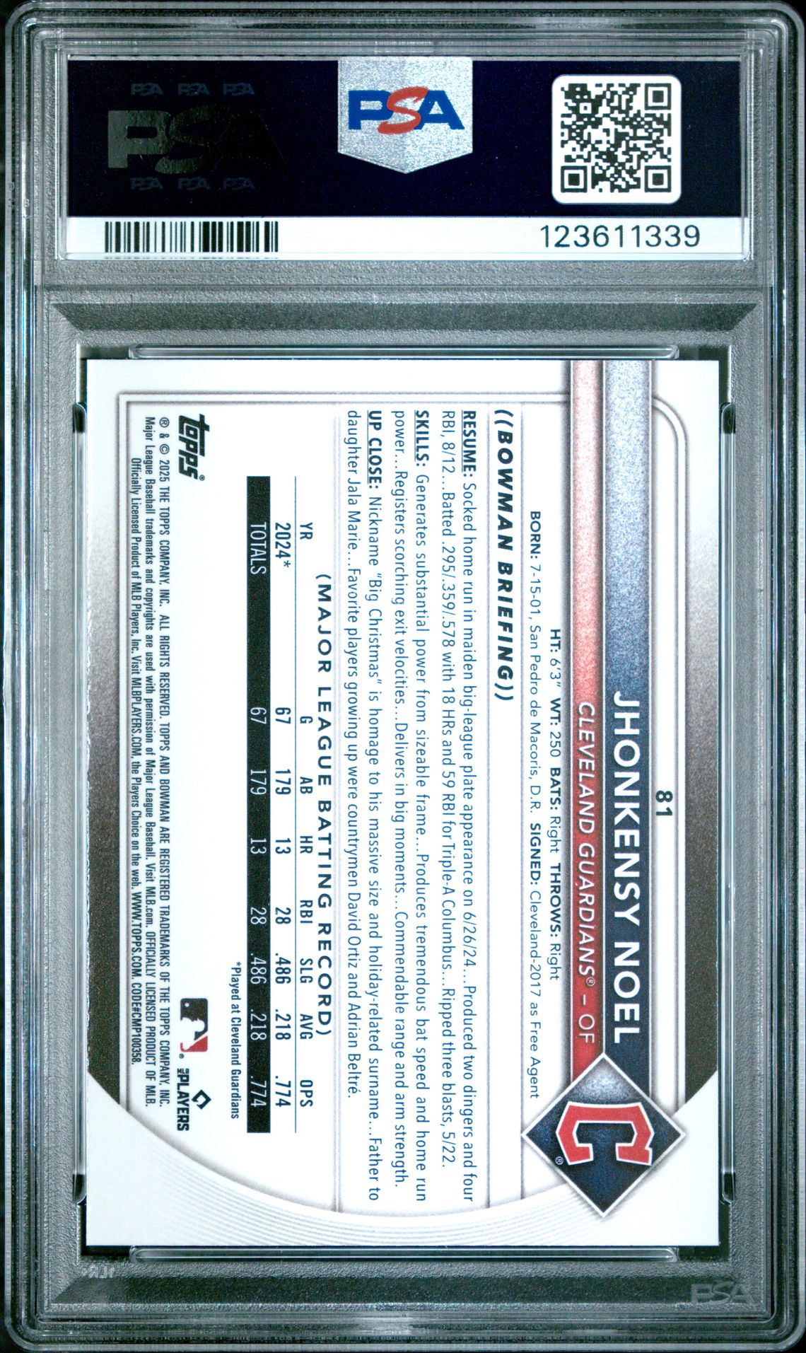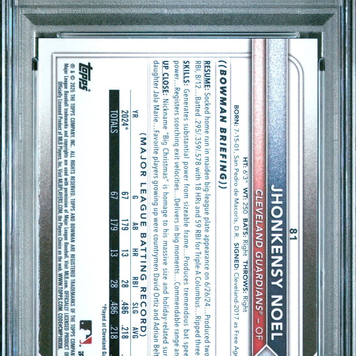Product Name: 2025 Bowman #81 Jhonkensy Noel Chrome Red Rookie Redemption PSA 10